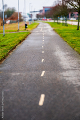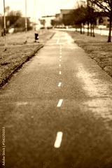 urban pathway lined with trees and streetlights.
