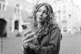Young woman listening music while walking in the street. Travel, tourism, technology, blogging concept