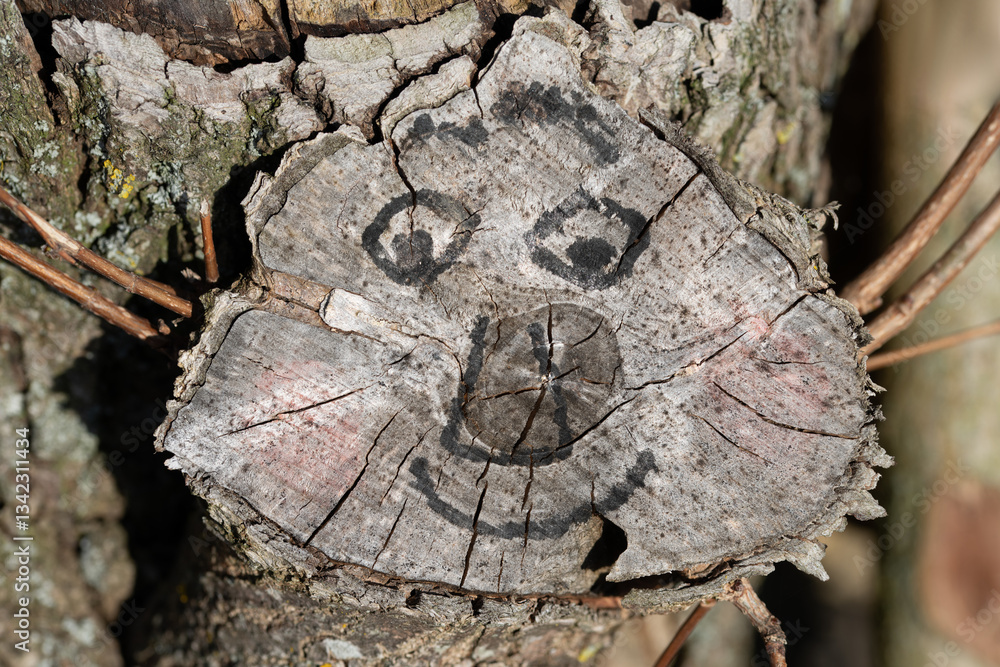 Close-up of a tree trunk on which a branch has been sawn off. A funny face is drawn on the cut surface. It looks as if it is looking out of the tree.