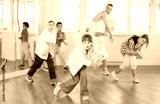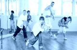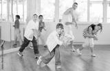 In sports studio, creative childrens team learns hip-hop dance accompanied by experienced man teacher