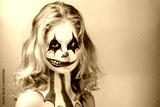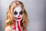 Portrait d'une jeune fille blonde maquillée en joker avec un faux sourire sur la moitié du visage