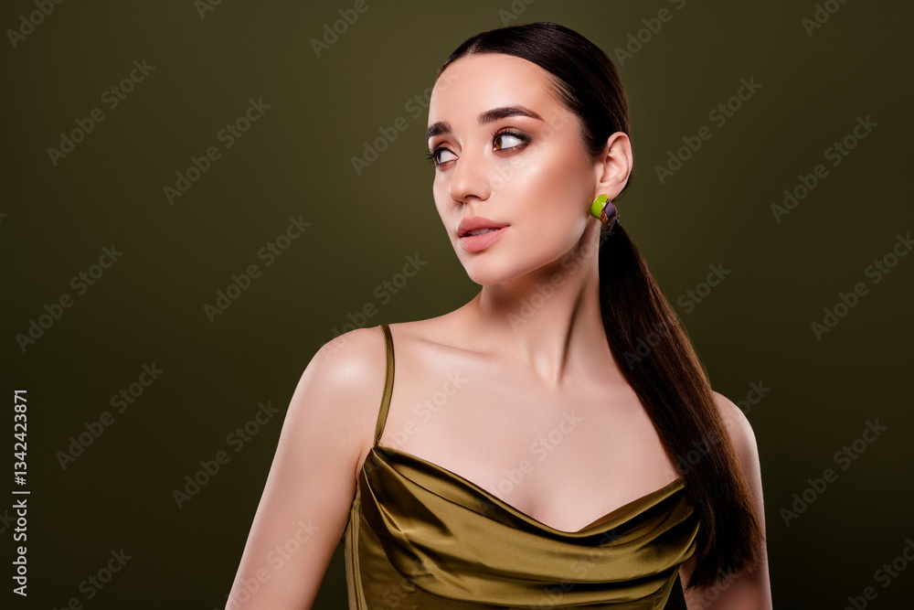 Photo of stunning charming lady star festive event visage empty space over khaki color background