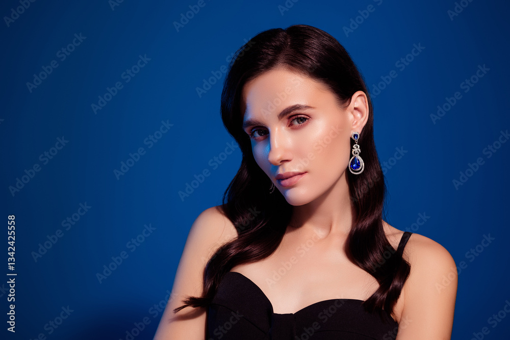 Elegant woman with dark hair and glamorous earrings on striking blue background