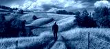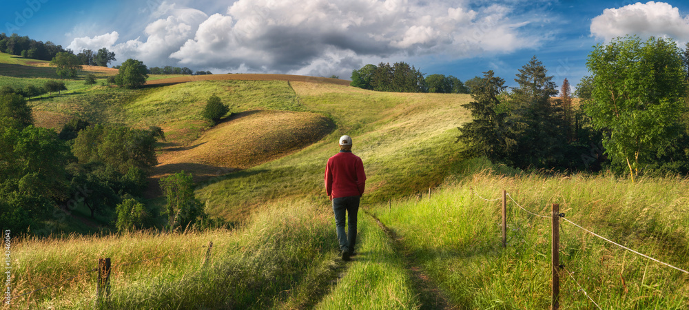 A hike in an amazing landscape with rolling hills. Hiker walking on a scenic path through meadows.