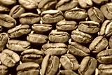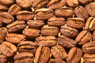 Macro shot of aromatic roasted coffee beans on a reflective golden surface, highlighting texture and color for culinary use.