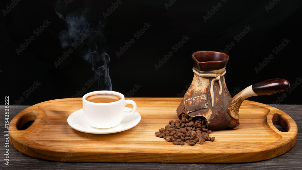 black manual coffee grinder for coffee beans and six glass transparent jars with black lids filled with roasted coffee beans and earthenware for brewing coffee on a white background.