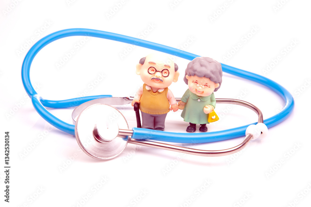 Two miniature elderly figurines, a man with a cane and a woman with a bag, stand beside a blue stethoscope on a white reflective surface, symbolizing healthcare and aging