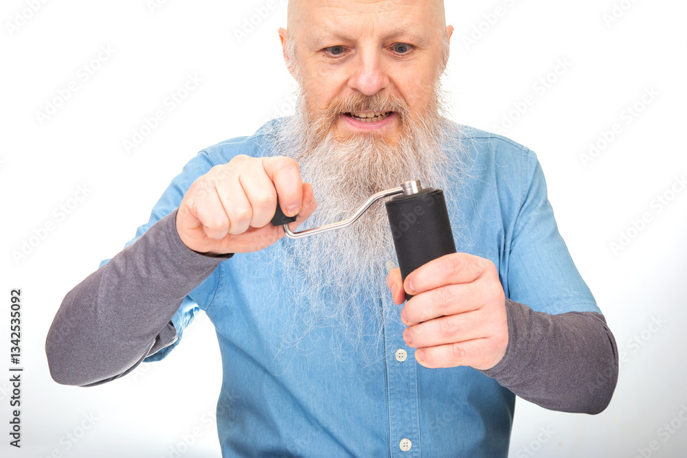A cheerful bald man with a long white beard grinds coffee beans with a manual grinder, wearing a blue denim shirt with gray sleeves, set against a plain white background