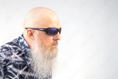 portrait of a successful bald man with a large gray beard wearing sunglasses on a light background.