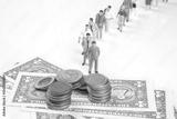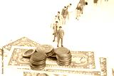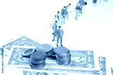 A creative composition featuring miniature figurines of people standing in a line, with stacks of coins and U.S. dollar bills in the foreground, symbolizing financial hierarchy or economic concepts