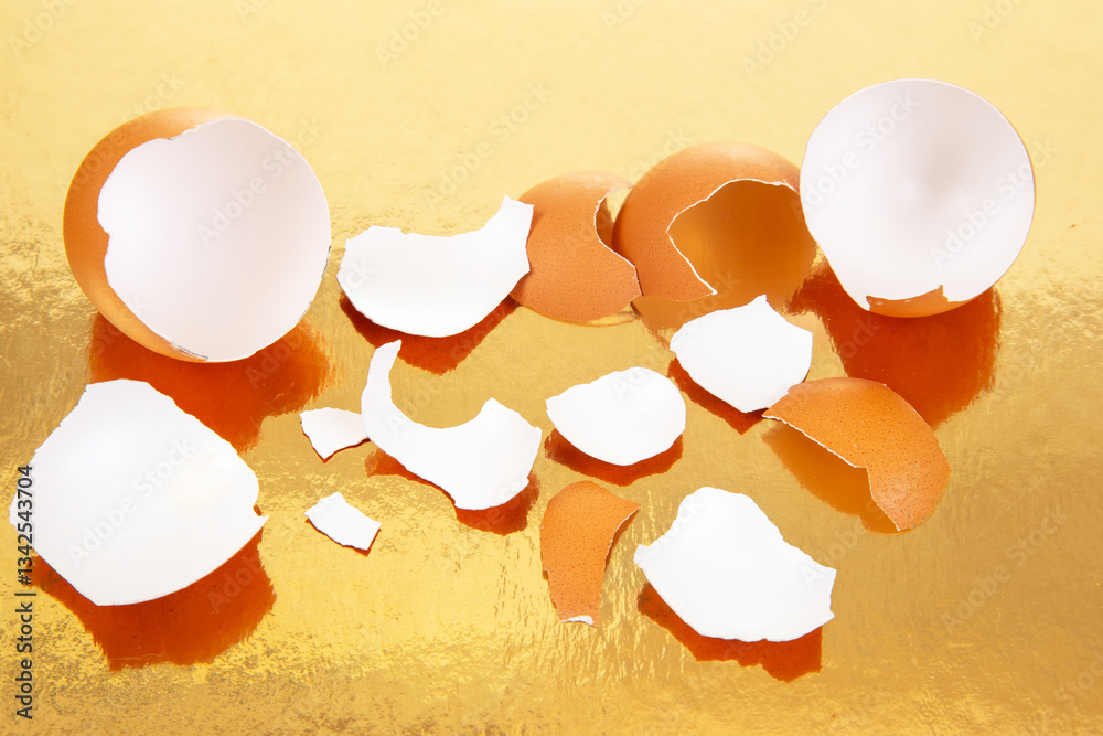 Two broken brown eggs with scattered eggshell fragments on a reflective golden surface, showcasing a dramatic and textured food photography scene with warm tones.