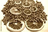 Warm-toned coffee beans and dried orange slices on a reflective golden backdrop, ideal for food and beverage photography. coffee aroma and taste citrus descriptors