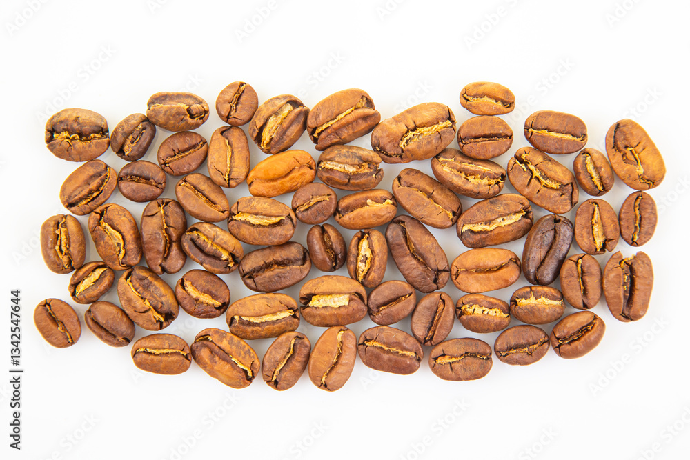 High-resolution image of roasted coffee beans, highlighting their warm brown shades and natural fissures on a white background. Suitable for caffeine visuals.