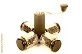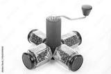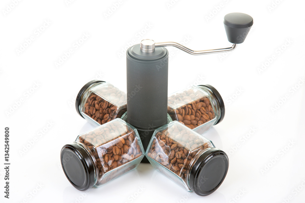 black manual coffee grinder for coffee beans and four glass transparent jars with black lids filled with roasted coffee beans and earthenware for brewing coffee on a white background.