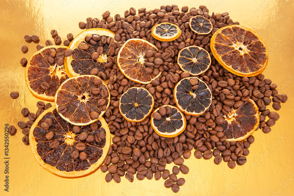 Aromatic coffee beans paired with dried orange slices on a golden surface, creating a rich, inviting food still life. coffee aroma and taste citrus descriptors