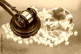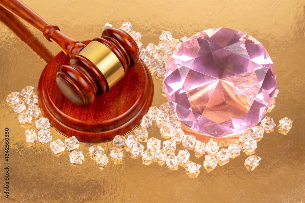 A wooden gavel with a gold band sits beside a large, sparkling pink diamond on a reflective gold surface, symbolizing justice and wealth.