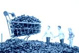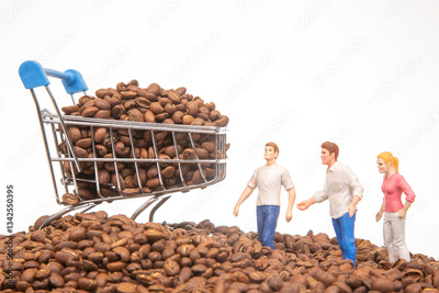 Conceptual stock photo with small figurines on coffee beans and a shopping cart, illustrating group effort in coffee commerce. coffee business concept