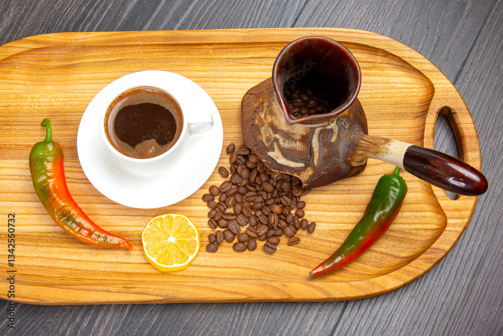 A rustic wooden tray holds a steaming cup of coffee in a white cup, a traditional cezve pot, and scattered coffee beans against and pepper
