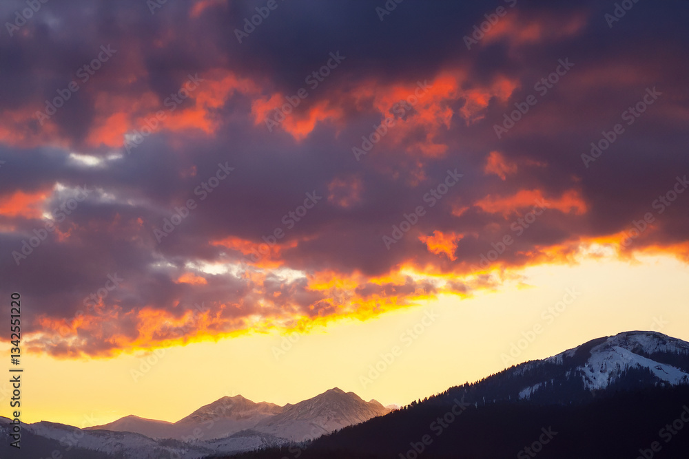 Vibrant sunset over the horizon with a colorful sky of orange, pink, and blue hues. Scattered clouds reflect the sunlight, creating a serene and picturesque scene, perfect for nature