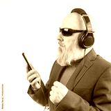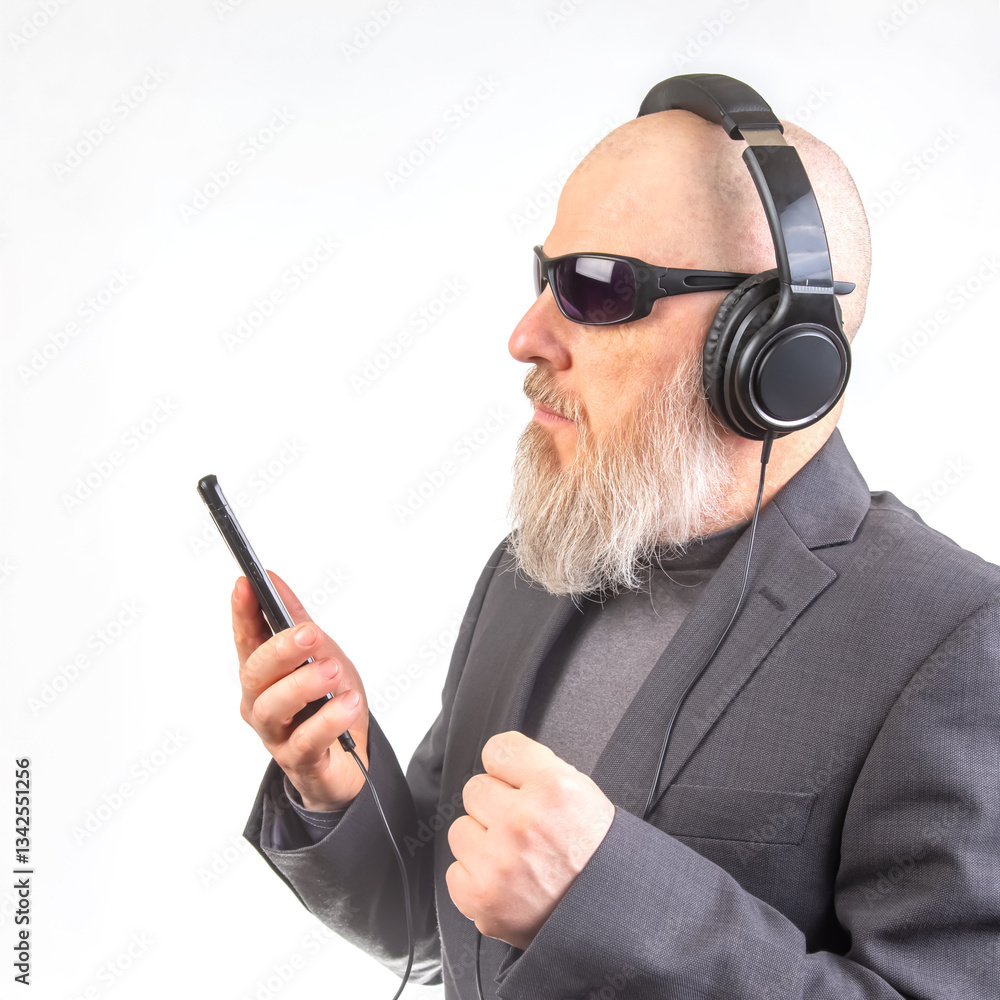 bearded man in sunglasses with headphones listens to music using a player on a white background. audio style and sound technology