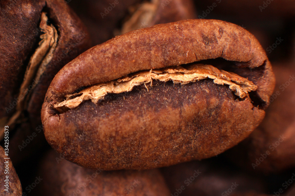 Detailed macro view of a cracked roasted coffee bean among other beans, showcasing its glossy surface and natural tones. Great for culinary visuals.