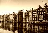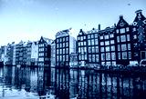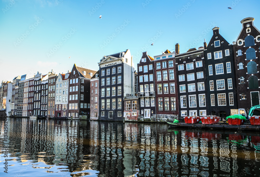 AMSTERDAM, NETHERLANDS - DECEMBER 17, 2017: Famous buildings and place of Amsterdam city centre at sun set time. General landscape view. December 17, 2016 - Amsterdam - Netherlands.