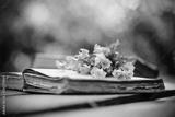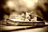 Old open book and bouquet of buttercups.