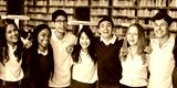 Group of diverse students in a library. Students in uniforms, library setting. Happy students, diverse group, library environment. Young diverse students learning together in library.