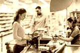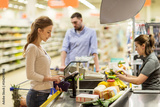 woman buying food at grocery store cash register
