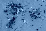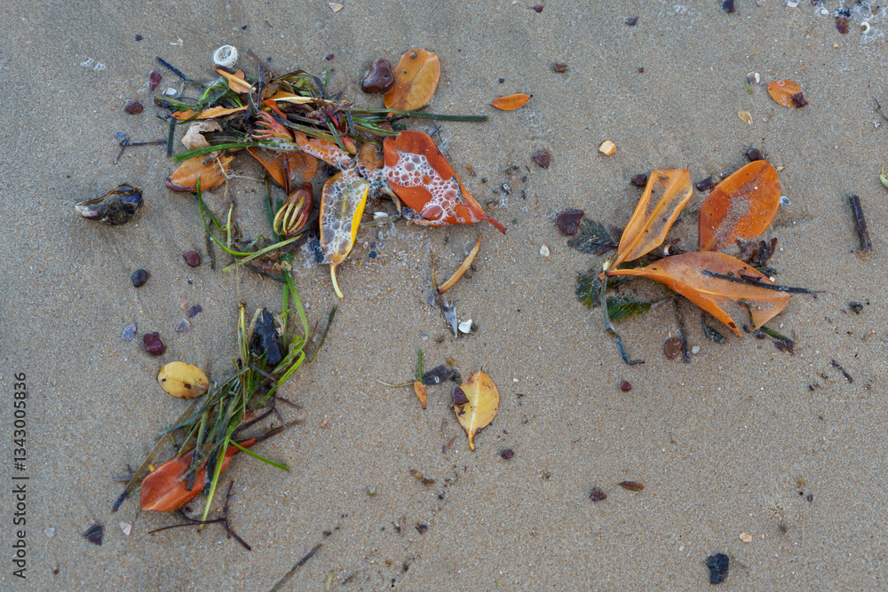 Close-up of orange mangrove leaves and flowers, and sea grass washed up on the beach. Norfolk Beach, Coochiemudlo Island, Queensland, Australia