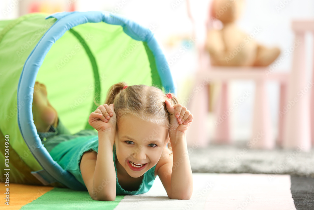 Closeup of cute little girl playing at home