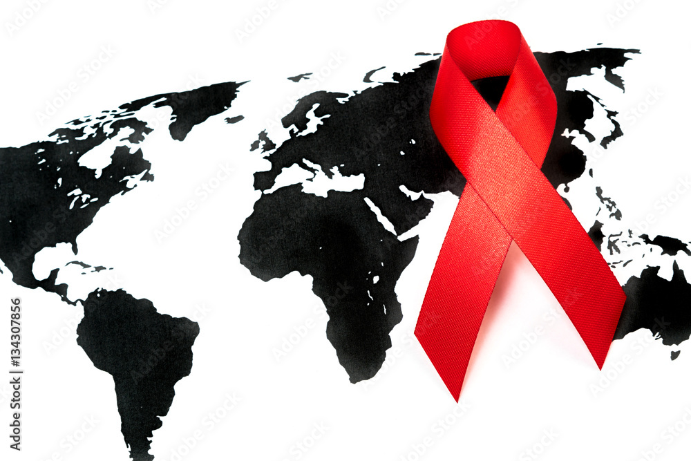 World cancer day : Breast Cancer Awareness Ribbon on world map .