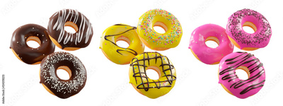 Assorted donuts with colorful icing, sprinkles, and chocolate isolated on white transparent background. 3d rendering and illustration of dessert variety