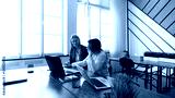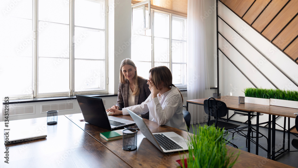 Two professionals collaborating on a laptop in a modern office setting during daytime