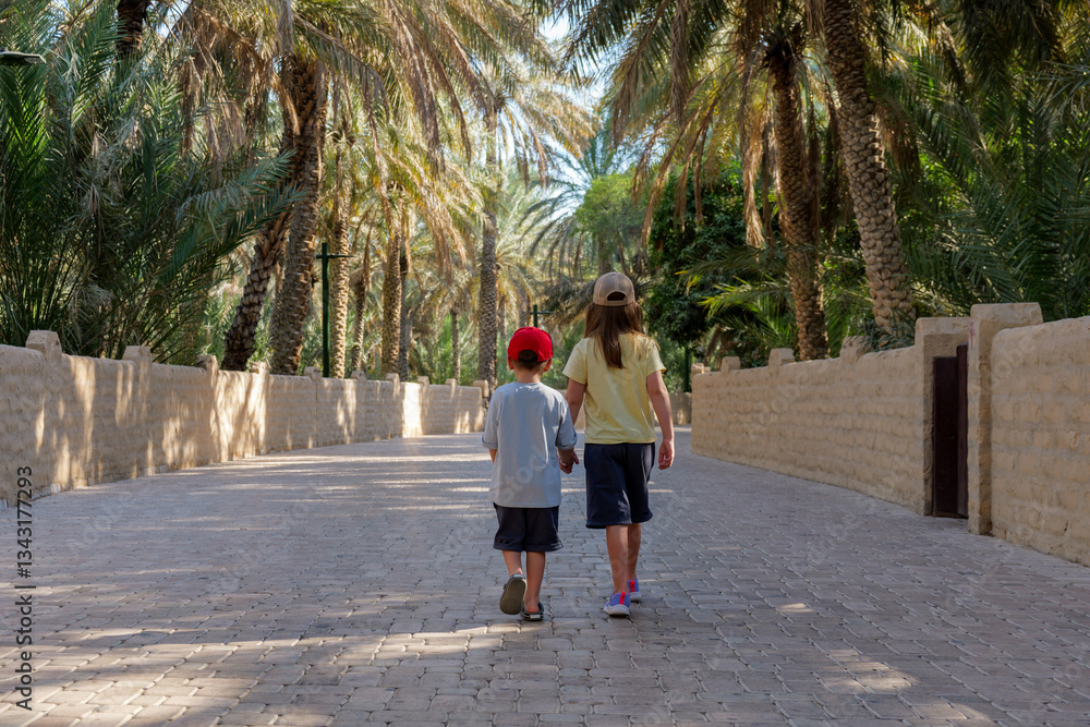 Two kids walk through Al Ain Oasis, UAE, a popular tourist spot. The oasis offers shade and a cool escape from the heat, making it a perfect place for a relaxing walk in nature