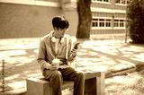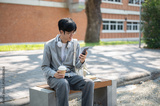 Asian man with glasses looking at his phone while holding a coffee cup sitting on the sidewalk bench