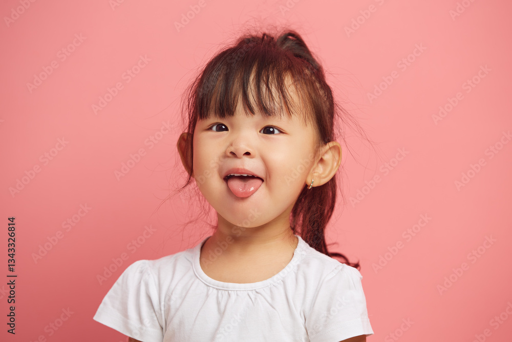 Cheerful mischievous little asian appearance girl shows her tongue to the camera, smiling cheerfully while standing on a pink polished background. Joyful child headshot portrait.