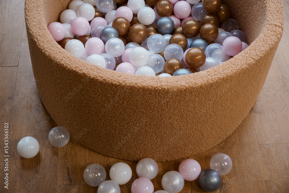Soft Children's Ball Pit Filled with Multicolor Plastic Balls on Wooden Floor