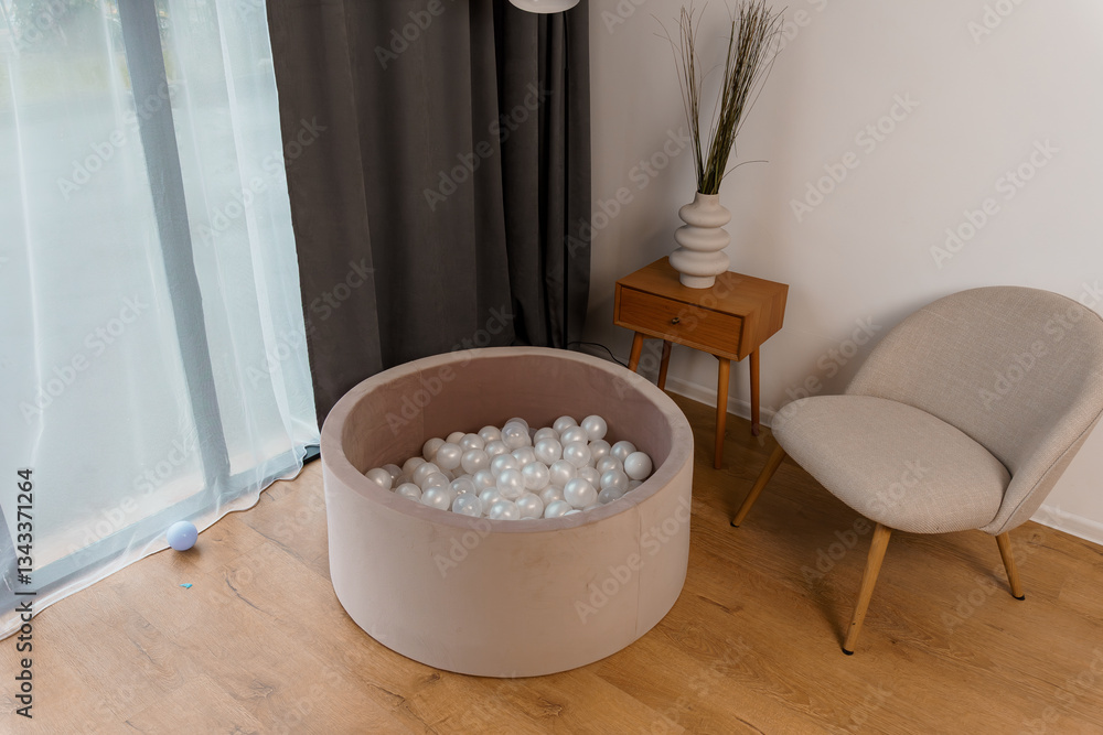 Modern Home Interior with Beige Ball Pit Filled with White Balls Near Window Curtain, Wooden Side Table, Vase, and Comfortable Chair