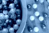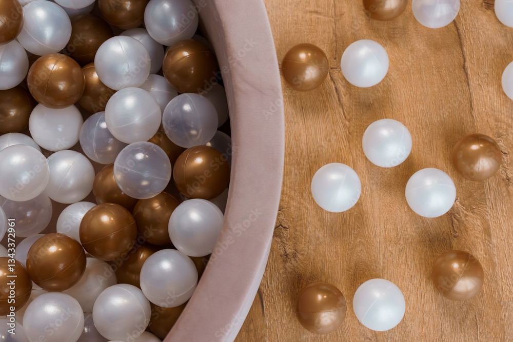 Close-up Overhead View of Brown, White, and Transparent Plastic Balls in Play Area