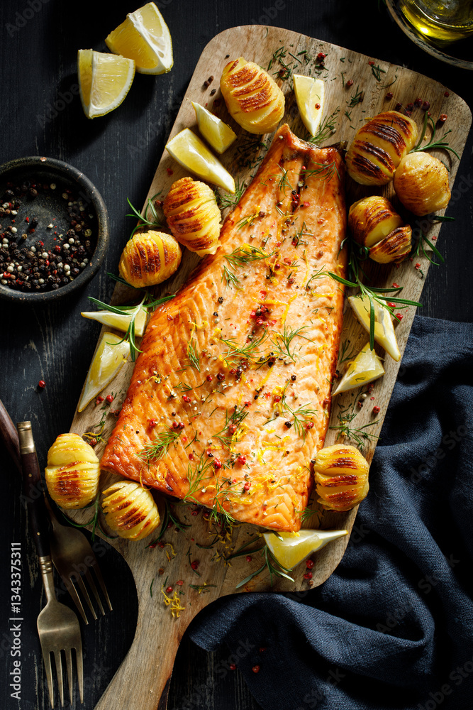 Roast salmon fillet seasoned with lemon zest and herbs with hasselback potatoes, top view