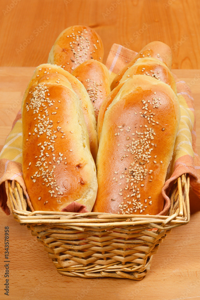 A close-up shot of a woven basket filled with freshly baked buns sprinkled with sesame seeds, displaying their golden crust and soft texture