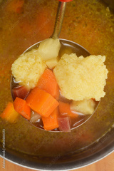 A close-up, overhead shot of a ladle filled with vegetable soup containing semolina dumplings and diced carrots, showcasing the hearty and comforting dish