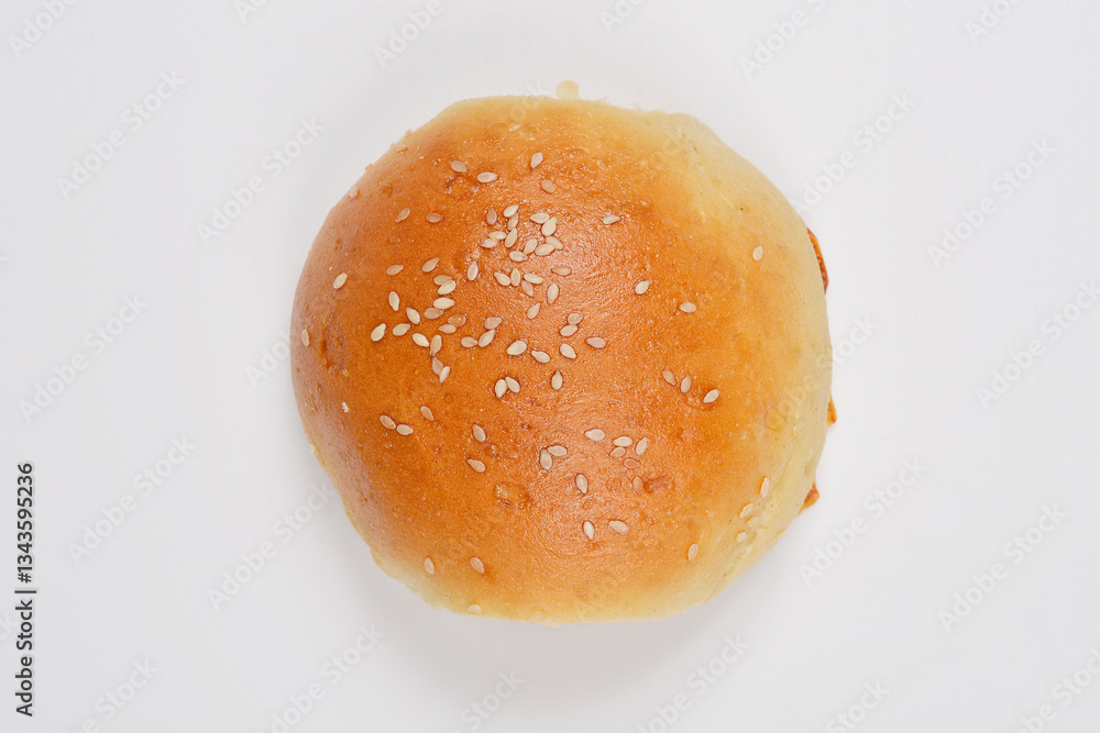 A single homemade hamburger bun sprinkled with sesame seeds lies on a white background