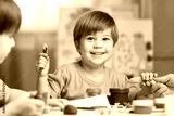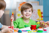 Children creativity. Kids sculpting from clay. Cute little boys mould from plasticine on table in kindergarten