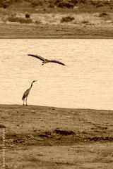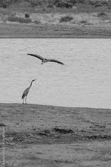 dwie Czaple Czarnogłowe (Ardea cinerea) przez zbiorniku wodnym, Park Narodowy Tsavo i rezerwat wzgórz Taita, Kenia, Afryka