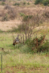 Drop olbrzymi (Ardeotis kori), zwany Kori Bustarad na trawach sawanny. Gatunek bliski zagrożenia wyginięciem. Park Narodowy Tsavo i rezerwat wzgórz Taita, Kenia, Afryka