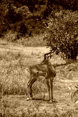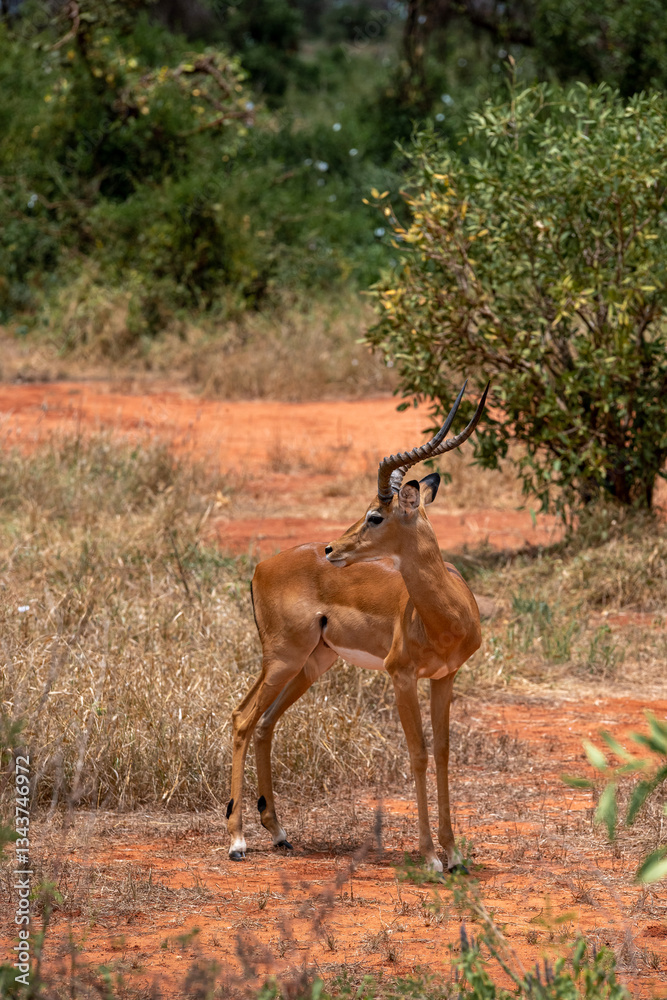 Impala - Aepyceros melampus, mała, szybka antylopa z afrykańskiej sawanny, Samiec z pięknym porożem, Park Narodowy Tsavo i rezerwat wzgórz Taita, Kenia, Afryka