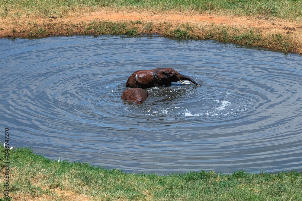 młode słowie afrykańskie (Loxodonta africana), kąpiące się w małym zbiorniku wodnym na sawannie w Park Narodowy Tsavo East, Kenia, Afryka