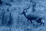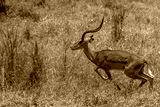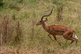 Impala - Aepyceros melampus, biegnąca antylopa z afrykańskiej sawanny, Samiec z pięknym porożem, Park Narodowy Tsavo i rezerwat wzgórz Taita, Kenia, Afryka